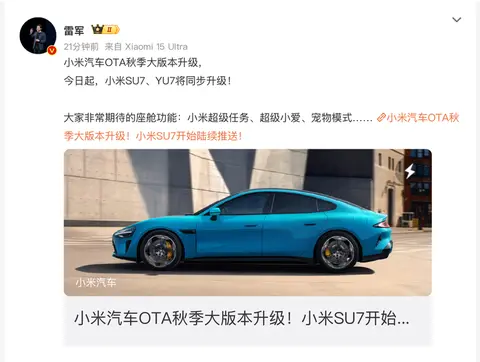 雷总同步发文,小米汽车OTA秋季大版本升级。