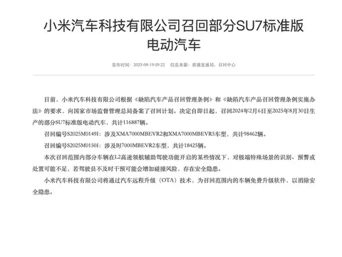 小米备案,自即日起,召回2024年2月6日至2025年8月30日生产的部分SU7标准版电动汽车,共计116887辆。本次召回范围内部分车辆在L2高速领航辅助驾驶功能开启的某些情况下,对极端特殊场景的识别、预警或处置可能不足,若驾驶员不及时干预可能会增加碰撞风险,存在安全隐患。