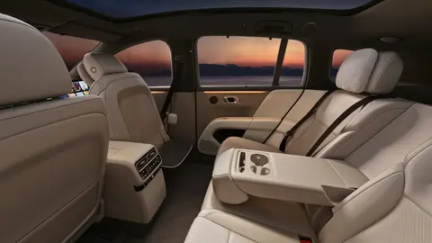 尽管是五座布局,但高配车型在后排顶部搭载了一块21.4英寸的折叠吸顶屏,该屏幕可能并非全系标配,未配备吸顶屏的车型将改用全景天幕设计,并配套提供电动遮阳帘。后排座椅还配有专属头枕与靠枕,侧窗则配备了手动遮阳帘。舒适配置上,新车还装备了后排冷暖双用冰箱。